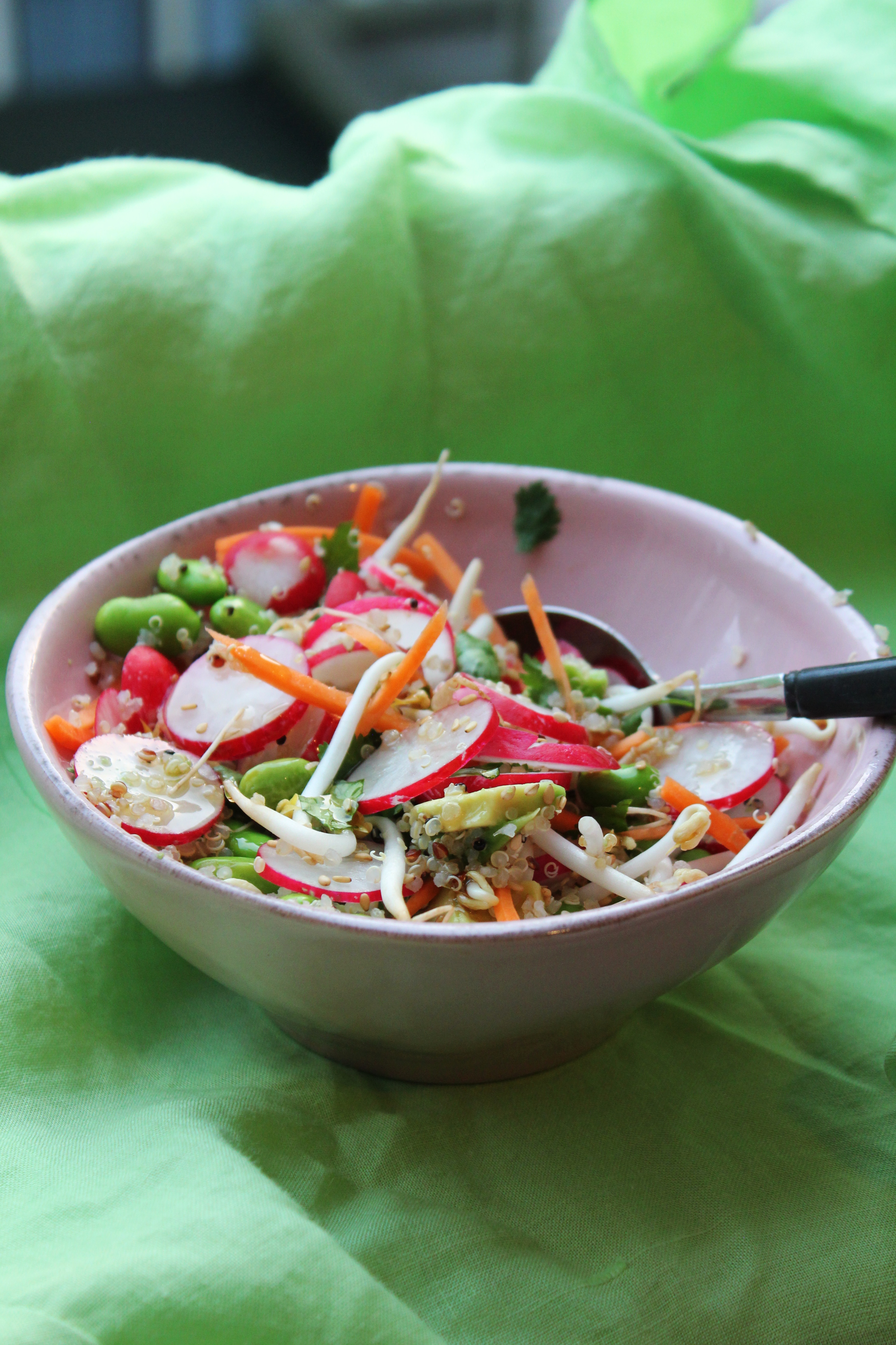Kook de quinoa zoals beschreven op de verpakking. Rasp de tl gember, meng deze samen met de halve el sojasaus, halve el rijstazijn, halve el sesamolie en de tl honing in een bakje tot een dressing.