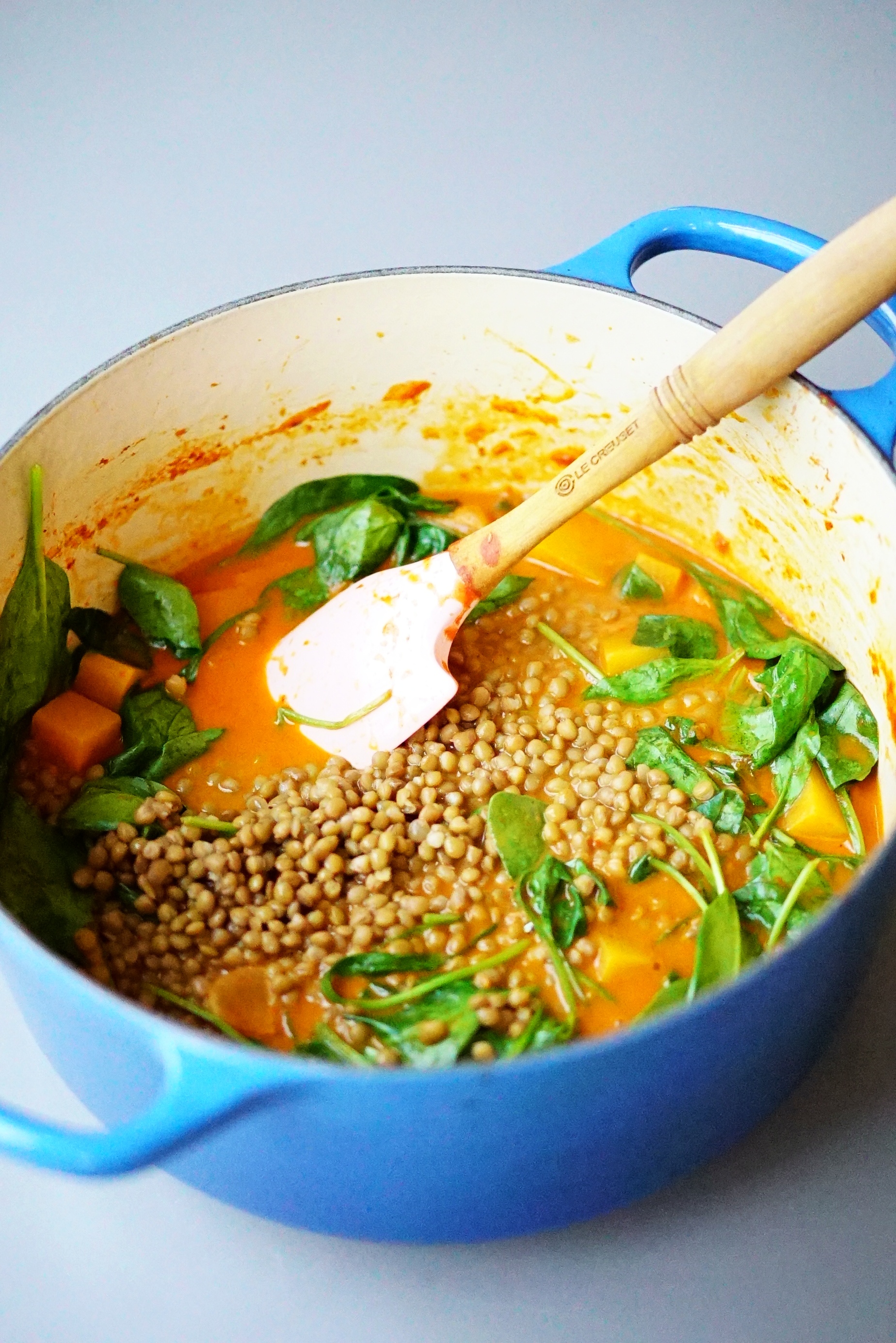 Laat de linzen uitlekken en voeg toe, samen met de spinazie. Voeg vervolgens het sap van 1 limoen toe. Roer goed door. Wanneer de spinazie is geslonken haal de pan van het vuur. Serveer met yoghurt en koriander.